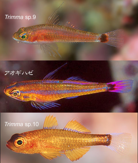 アオギハゼと異なるところは、 1-背中および体側に青い筋が全くない事。 2-尾びれに青い色がない事。 3-生息環境がアオギハゼと異なり、オーバーハングの下には居ず、斜面にホバリング している事。深場にしかいない事。 4-Trimma sp.9 はアオギハゼと混泳しておらず、カスリモヨウベニハゼと混泳しており、 その場所にはTrimma sp.9 は10匹以上の疎なグループを形成してホバリングしている。 私見では、アオギハゼと住み分けしているのでは、と思います。 参考までに下にアオギハゼと並べて表示してみました。比較検討してみてください。 |